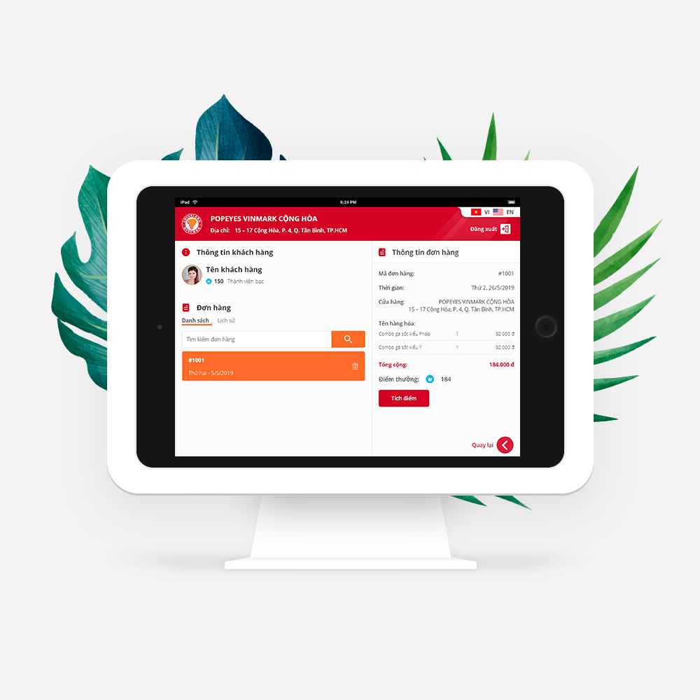Popeyes Vietnam Mobile App is a tablet-first POS solution built to orchestrate high-volume restaurant operations, from order-taking and payment capture to loyalty redemptions and kitchen alerts. I helped blend React Native flows with Magento APIs, real-time order handling, vouchers/points redemption, and push notifications so the front-of-house stays synced with back-of-house in every store.