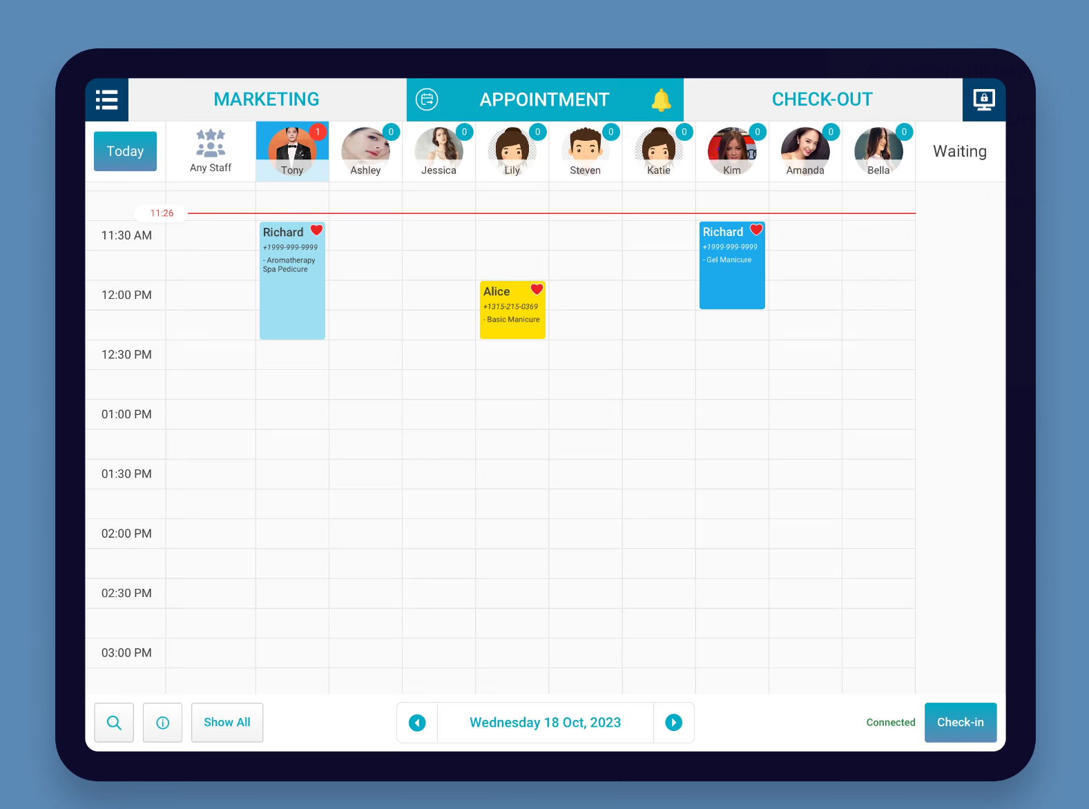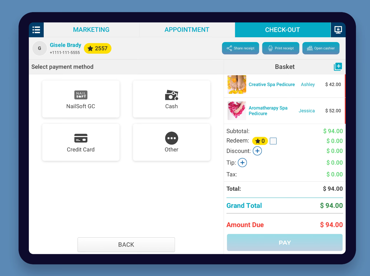 NailSoft salon is a tablet-based POS platform designed for salons to orchestrate appointment scheduling, POS scanning, and real-time reporting. I helped integrate a WebView-based calendar so the iPad could render existing scheduling UIs while still supporting drag-and-drop rescheduling, live chart reporting, and the native payment workflows required for high-touch beauty service environments.